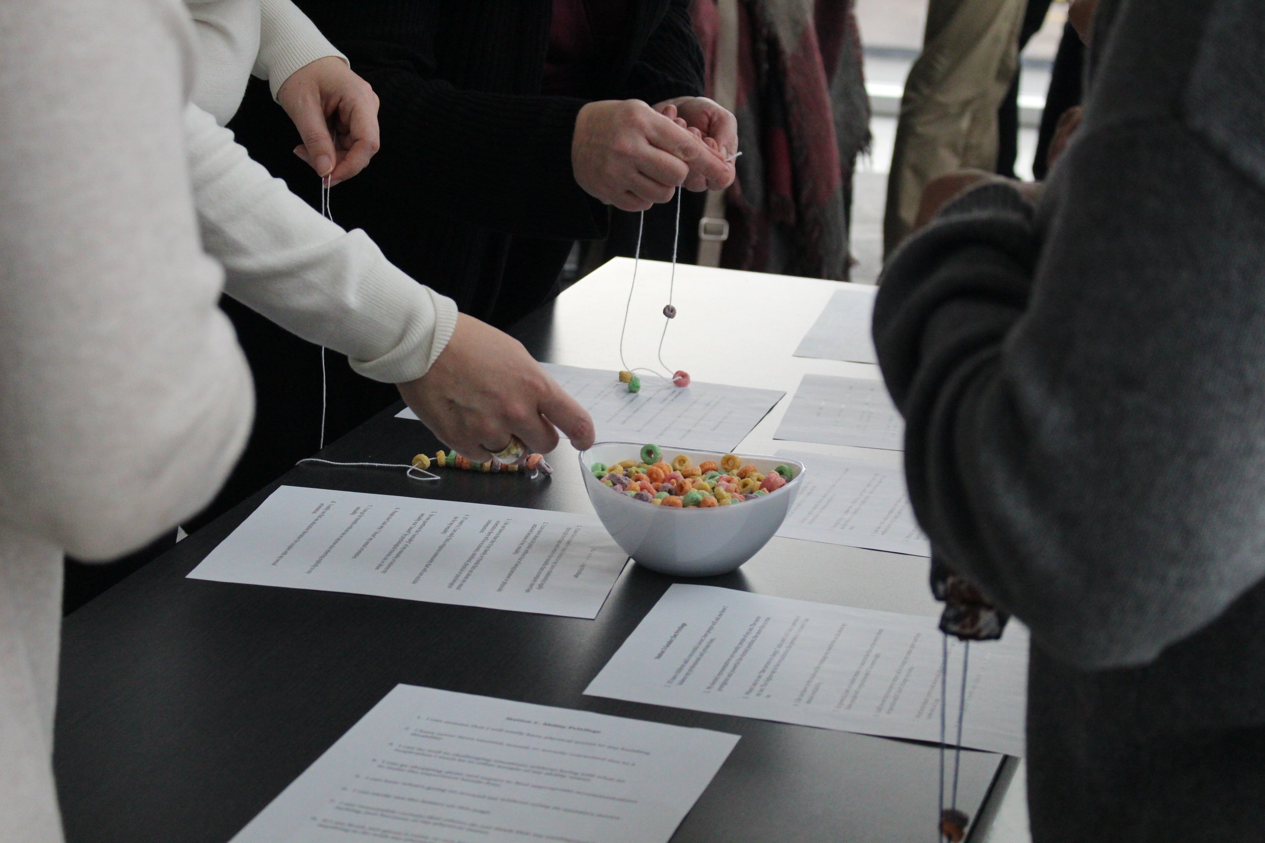 Rather than simply defining privilege or giving us some examples of privilege in operation, Mojdeh had us complete an interactive activity to acknowledge and explore personal power and privilege. It involved stringing fruit loops (in place of beads) onto a piece of yarn every time we answered “yes” to having a particular privilege. These privileges were laid out in lists and categorized around various identities (e.g. gender, race, class). After completing the exercise, we were told to tie off our string and wear it as a necklace.