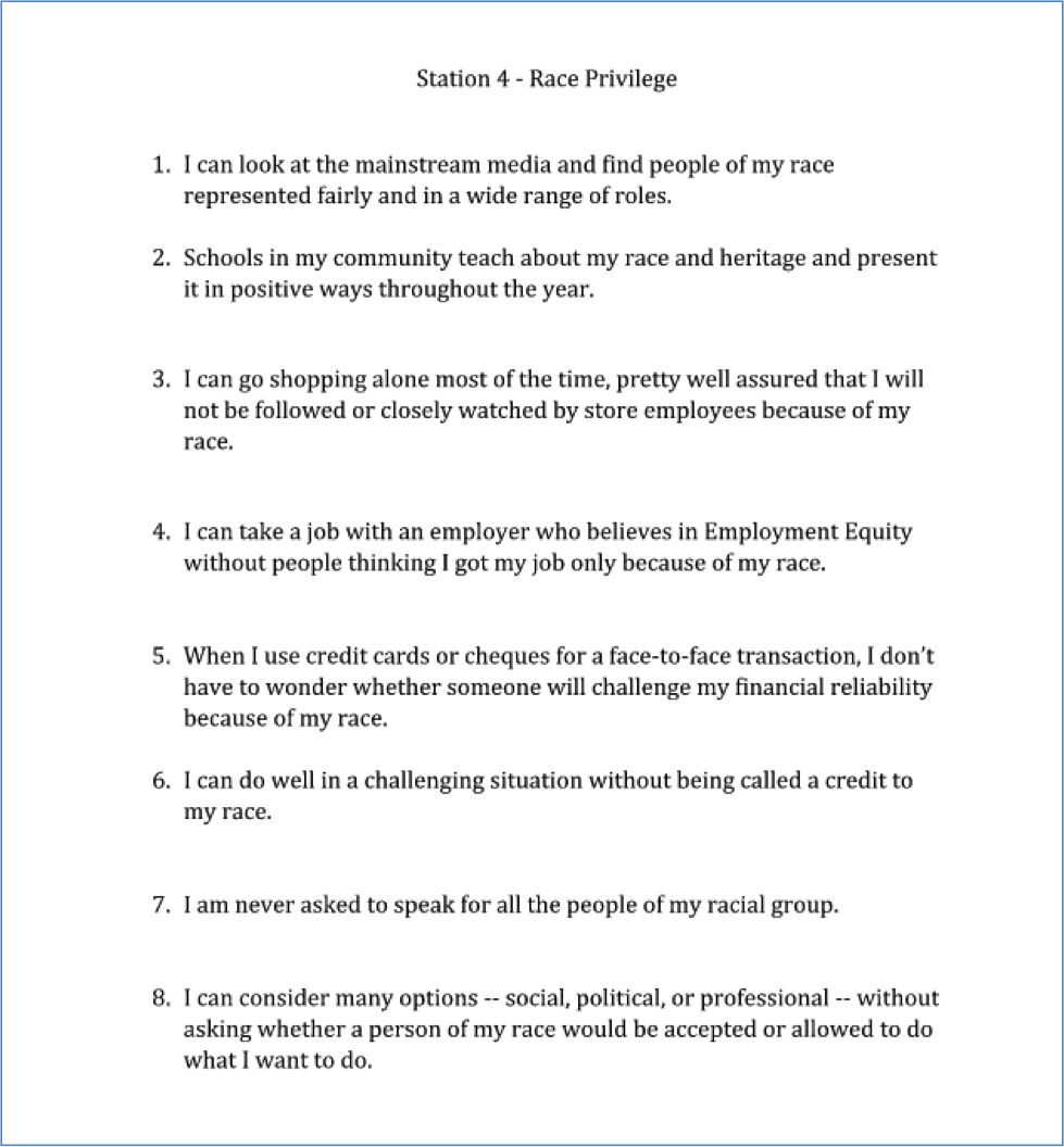 Although it may have been useful for this exercise to classify the privileges by identity, it is important to emphasize that these identities (e.g. race and gender) are not completely independent of one another. The privilege or oppression you experience is the result of the intersection of numerous identities and related systems of discrimination and oppression.