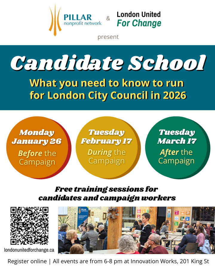 Join London United for Change and Pillar Nonprofit Network for three sessions of Candidate School focusing on what you need to know before, during and after an election campaign. Learn from local experts, individuals with lived experience, and community leaders about topics such as developing a campaign strategy, fundraising, branding, communicating with voters, and transitioning to the role of city councillor.